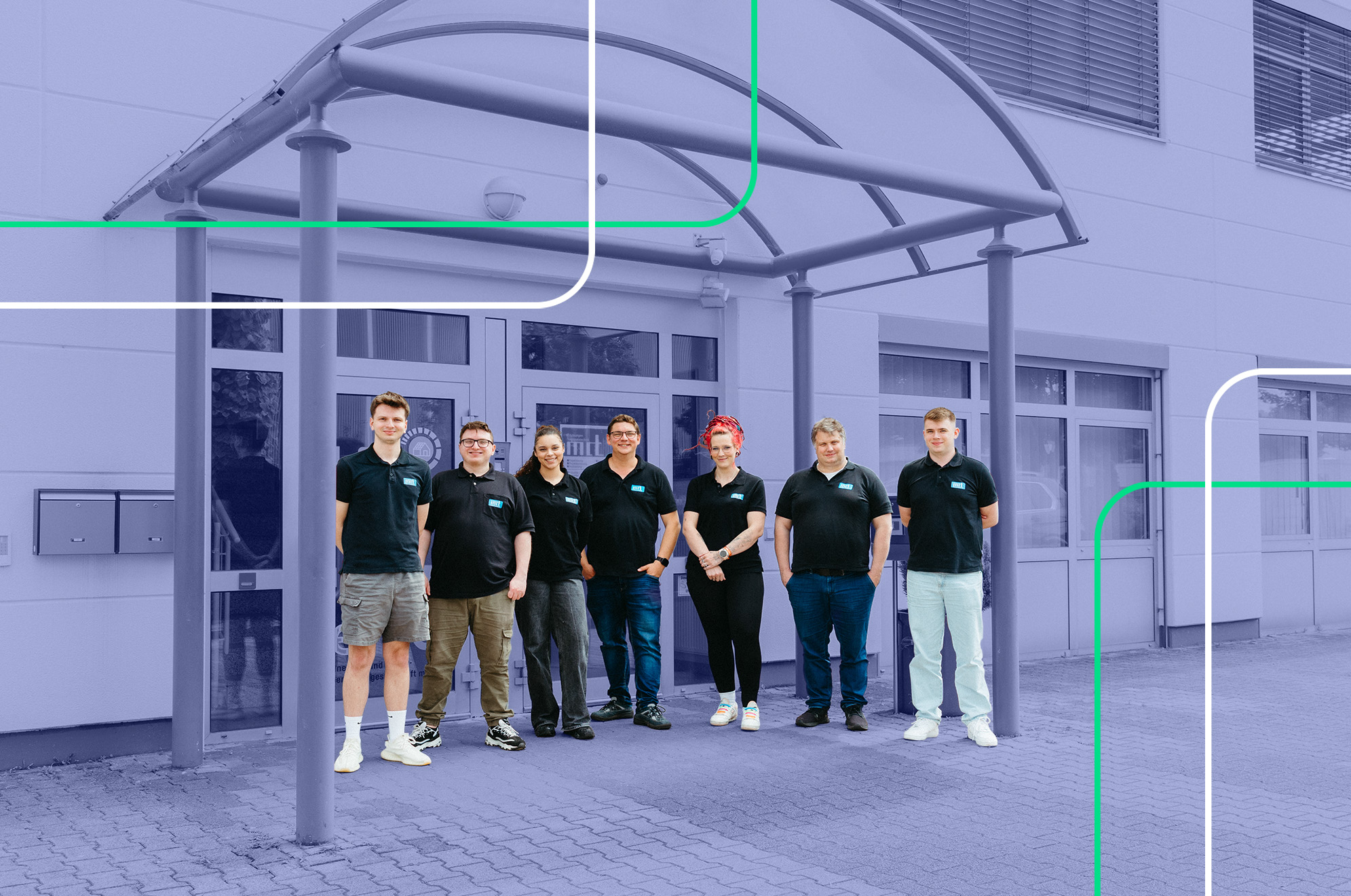 IT-Mitarbeiter Teamfoto vor Firmengebäude